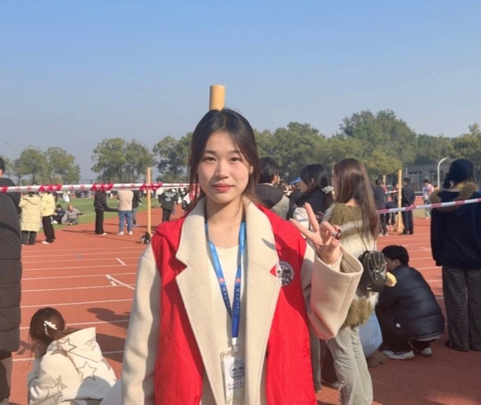 比赛当天,陈玟涵身着志愿者马甲,穿梭于各个项目场地旁维持秩序。时而俯身整理器械,时而为运动员递上补给。有长跑运动员冲过终点后体力不支时,她总能第一时间上前搀扶,并提供必要的帮助。在田径跑道旁,她耐心引导观赛同学,维持着场边的秩序;协助裁判老师整理器材,确保比赛流程顺畅;她用无声的行动构筑起赛事最坚实的后勤保障。