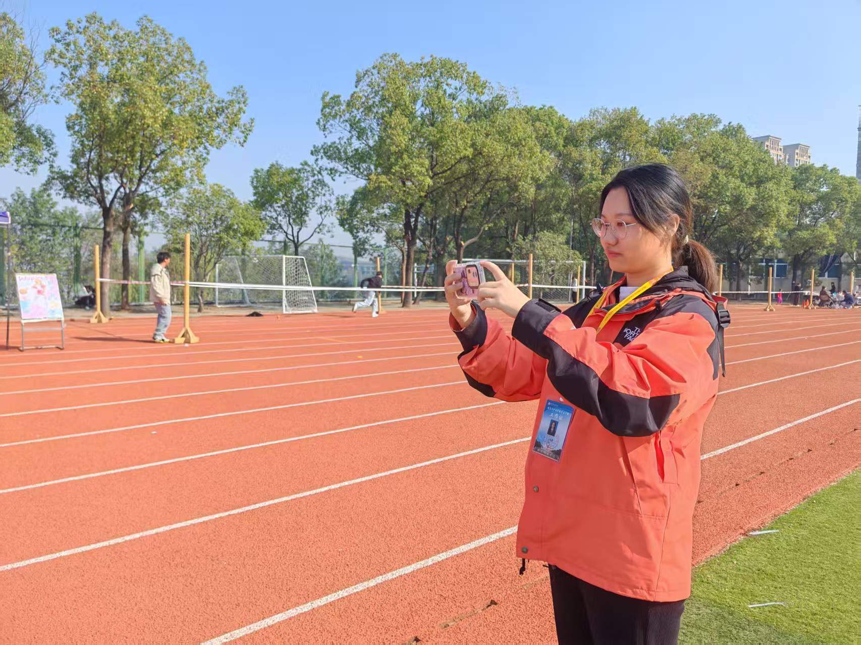 彭雅泽带着相机准时现身操场,一到现场便投入赛事摄影工作。她提前熟悉赛程安排,循着赛事进程辗转各比赛场地,专注捕捉学院运动员的赛场拼搏瞬间。“我希望能把运动员们起跑时的蓄力冲刺、跳跃时的腾空姿态、冲线后的喜悦神情都定格下来。”带着这份想法,她专注捕捉每一个赛场画面。拍摄结束后,她第一时间分类整理存档照片,细致核对每一张影像,确保赛事影像资料完整规范,为学院留存下珍贵的赛场记忆。
