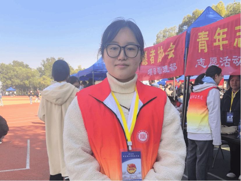 本届校运会中,陈妍被分配在志愿服务组。这是一个需要灵活应变和高效执行力的岗位,主要负责处理各类突发状况、进行临时人员调配以及保障物资搬运。她穿梭于各个赛点之间,确保服务工作无缝衔接,为运动会的顺畅进行提供了坚实的后勤支持。当被问及为何选择在校运会担任志愿者时,她认为,在运动会这样的集体活动中担任志愿者,不仅能亲身体验赛场内外的激情与感动,更能通过实际服务锻炼自己的应变能力和协调能力。与此同时,与来自不同学院的志愿者伙伴们为了共同目标而并肩奋斗的经历,也让她收获了珍贵的友谊。