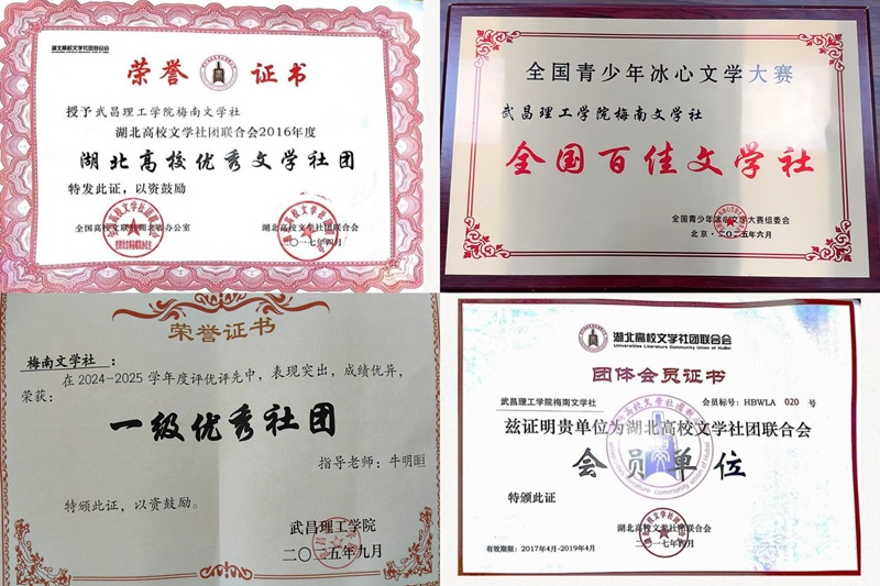 在专业教师的指导下,梅南文学社秉持“以赛促学、以学促创”的发展理念,助力社员提升文学素养与实践能力。社团在各类文学赛事中表现突出,社团曾获评“冰心文学奖全国百佳社团”,累计有46名社员在冰心文学大赛中获省级奖项,28名社员曾获得国家级荣誉。前任社长夏梦雪曾获“华夏杯全国书画艺术大赛青年组铜奖”和“湖北省冰心文学大赛青少年组一等奖”。社员涂振宇在“第十九届青少年冰心文学大赛”中获省级一等奖,并在学校第十一届“梅南杯”文学作品创作大赛中荣获一等奖。这些成绩充分展现了社员扎实的文学功底与创作实力。