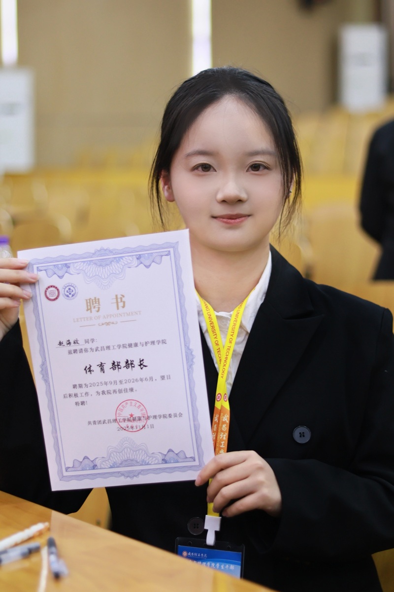 赵海姣,女,共青团员,武昌理工学院健康与护理学院护理2404班学生。现担任班级组织委员、宣传委员、健康与护理学院体育部部长、学院素质导师助理,曾担任班级军训负责人。曾荣获武昌理工学院“院级优秀学生”“院级优秀学生干部”称号,现凭借优异的综合表现,荣获武昌理工学院2024-2025学年度“国家励志奖学金”荣誉奖项。