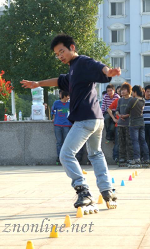 80余名滑轮爱好者集中表演了“正剪”、,“原地八字绕桩”,“后向蛇行过桩”等轮滑动作。此次活动由武汉科技大学中南分校滑轮协会发起,先后在华中科技大学等9所高校举行活动,武汉科技大学中南分校为最后一站。(