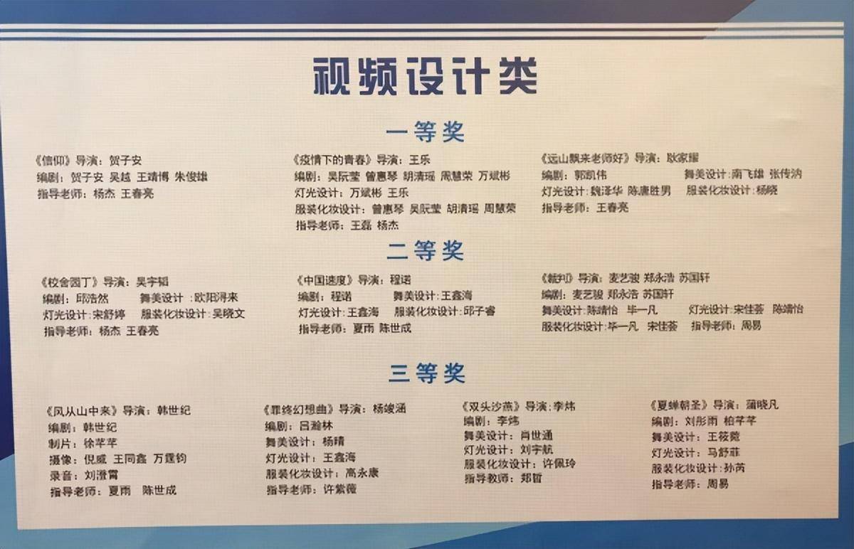 本次大赛汇聚了近年来舞美、影视、灯光、音响、服装等200余件参评作品,题材丰富、形式多元。经专家评审,武昌理工学院影视传媒学院10部影视作品获得视频设计类奖项。其中:一等奖3部,分别是《信仰》、《疫情下的青春》、《远山飘来老师好》;二等奖3部,分别是《校舍园丁》、《中国速度》、《裁判》;三等奖4部,分别是《风从山中来》、《最终幻想曲》、《双头沙燕》、《夏蝉朝圣》。