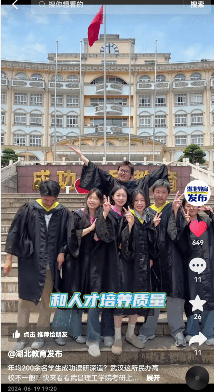 年均200余名学生成功读研深造?武汉这所民办高校不一般!快来看看武昌理工学院考研上岸学子的风采……(来源:湖北电视教育频道官方抖音号湖北教育发布 228万粉丝)