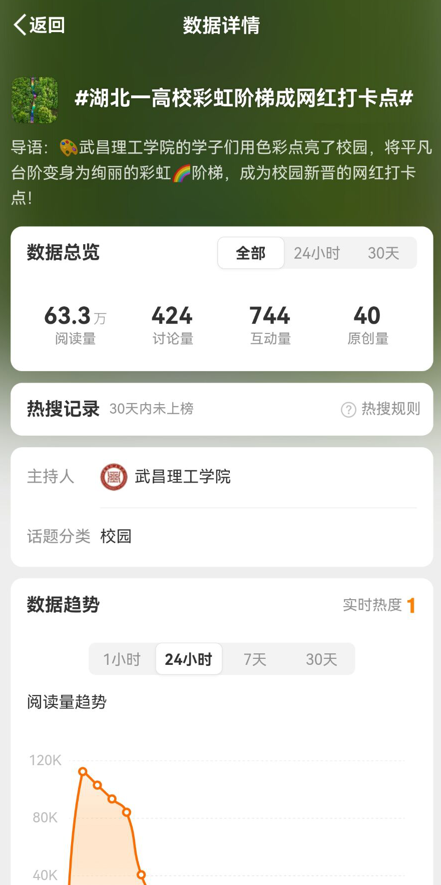 6月25日-26日,武昌理工学院官方微博发布的内容上榜热门微博,策划的话题#湖北一高校彩虹阶梯成网红打卡点#登上微博热搜,连续两天霸榜,最高位居微博同城热搜榜第6名,话题总阅读量超63万次,被武汉校园等微博大V转发互动,引发广泛关注和讨论。网友纷纷称赞“太美了”“真漂亮”“打卡圣地”......