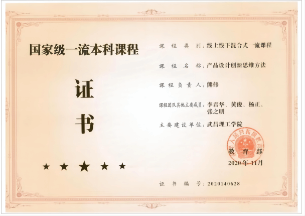 “一流课程”是“一流专业”的基础,“一流专业”是“一流人才”培养的源泉。近三年,该课程的学生评教在98分以上、同行评教在97分以上、学院督导和学校督导综合评教在98分以上、课程教学综合评价均为优秀。《产品设计创新思维方法》课程在教学中将设计竞赛作为学生的实训课题导入,取得了较好的成绩。此外,《产品设计创新思维方法》立项校级精品资源课程建设。以课程建设为依托,课程团队完成了省级教学研究项目2项,获批教育部产学合作协同育人项目2项。