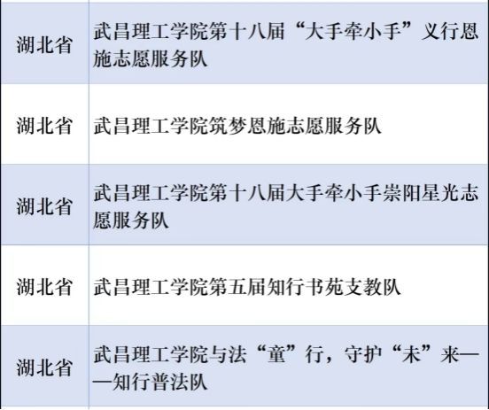 此次获奖的5支团队分别是:第十八届“大手牵小手”义行恩施志愿服务队、筑梦恩施志愿服务队、第十八届“大手牵小手”崇阳星光志愿服务队、第五届知行书苑支教队以及与法“童”行,守护“未”来知行普法队。