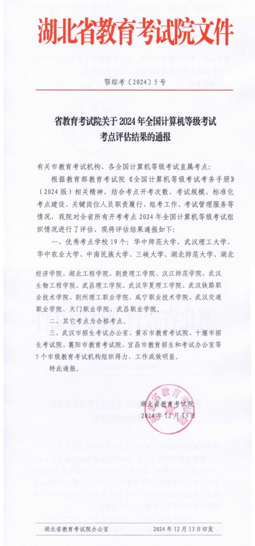文件指出,结合湖北省各考点开考次数、考试规模、标准化考点建设、关键岗位人员职责履行、组考工作、考试管理服务等情况,本次共有19所高校获评优秀考点,如华中师范大学、武汉理工大学、华中农业大学等,武昌理工学院作为少有的民办院校跻身其中。