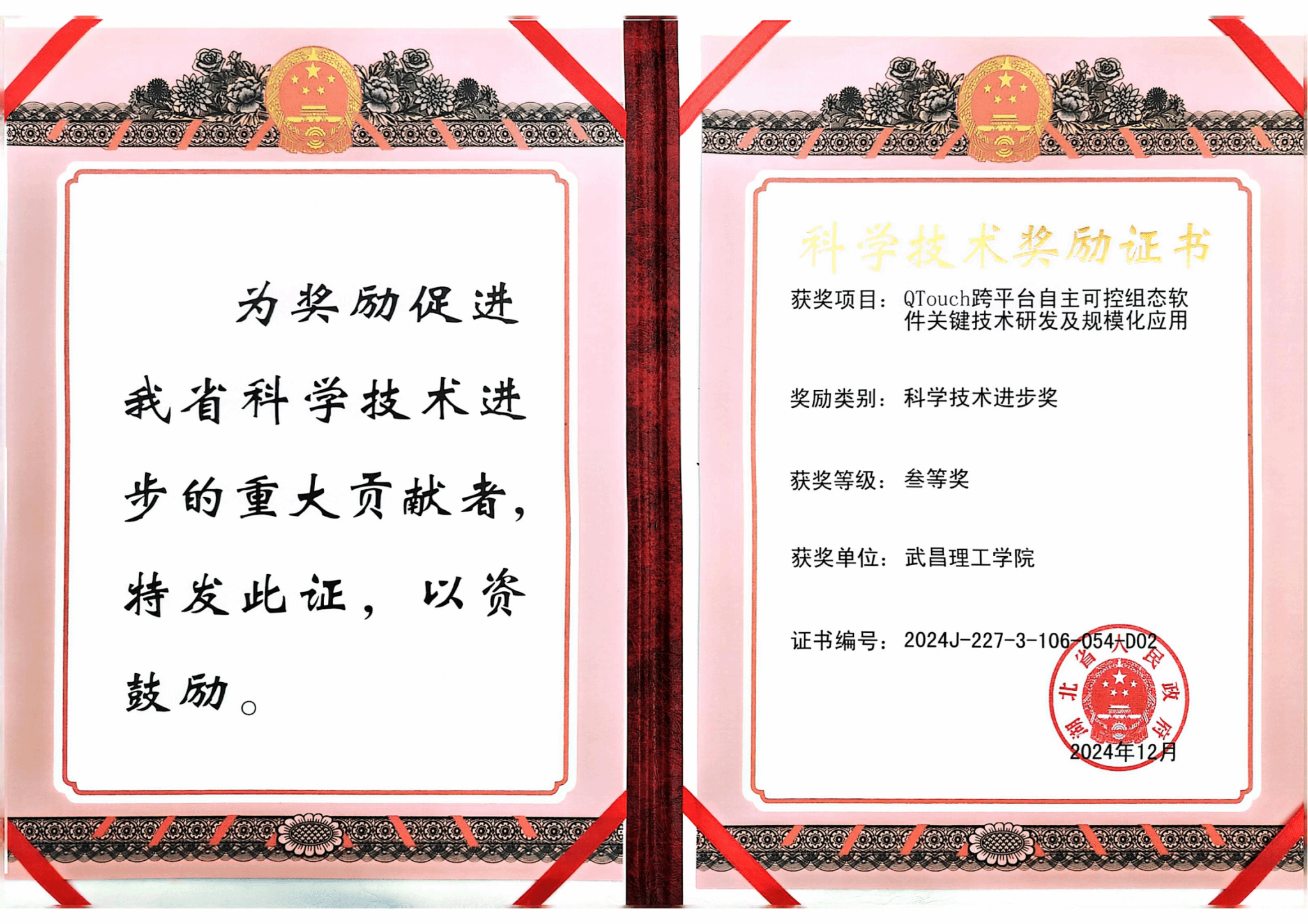 近日获悉,湖北省科技创新大会在武汉举行,会上宣读了《湖北省人民政府关于2024年度湖北省科学技术奖励的决定》,共授予337项(人)科学技术奖励。由武昌理工学院安庆教授主持的项目《QTouch跨平台自主可控组态软件关键技术研发及规模化应用》荣获湖北省科技进步奖三等奖。