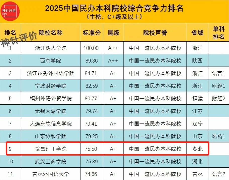 评价结果显示,武昌理工学院以标准分75.50分、A+评级,强势入选“2025中国民办本科院校综合竞争力排名”十强榜单,位列全国第九、湖北省第一,被认定为“中国一流民办本科院校”。