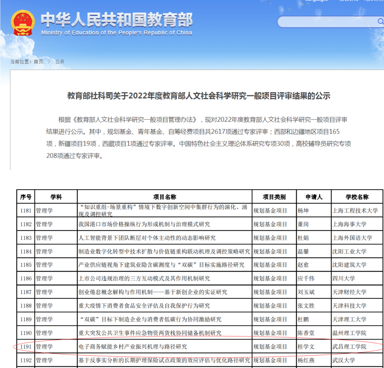 近日,教育部网站公示了2022年度教育部人文社会科学研究一般项目的评审结果。武昌理工学院商学院桂学文教授主持的课题《电子商务赋能乡村产业振兴机理与路径研究》成功立项规划基金项目。
