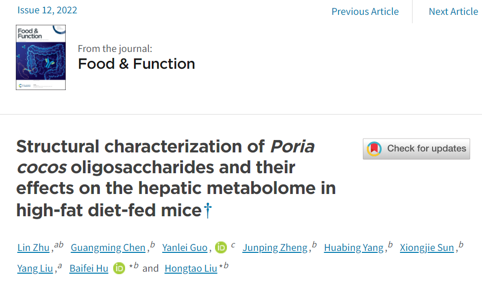 “防治肥胖,势在必行”。近日,武昌理工学院生命科学学院朱琳老师参与的团队在《Food & Function》杂志上发表了最新研究成果Structural characterization of Poria cocos oligosaccharides and their effects on the hepatic metabolome in high-fat diet-fed mice。在该研究中,首次从茯苓多糖中提取茯苓寡糖(PCO),并通过HPLC、GC-MS、FT-IR、NMR光谱等技术对其结构特征进行了分析鉴定。使用高脂饮食(HFD)喂养的血脂异常小鼠模型,通过非靶向代谢组学技术进一步证实PCO可以显著抑制血液和肝脏组织中的脂质积累和炎症反应。该研究揭示了PCO在治疗血脂异常方面的潜在应用。