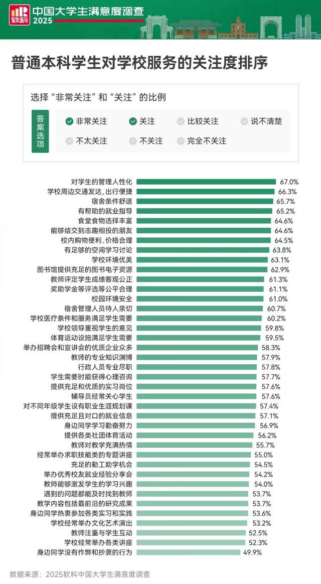 根据调查所体现的普通本科学生对学校服务的关注程度,学生管理、周边交通、宿舍条件、就业指导、校园食堂、结交朋友、货物便利便宜、学习讨论空间、学校环境图书馆电子资源、教师评定成绩公正客观、奖学金评定公平合理、校园环境安全等20个问题是本科生最为关注的项目。分析显示,武昌理工学院的高满意度得益于其“以生为本”“以学生为中心”的管理模式。近年来,该校不断升级教学和生活设施,建立校企合作就业平台,并优化图书馆资源等。学生普遍反馈,学校就读体验好,管理严格,人才培养成效显著。