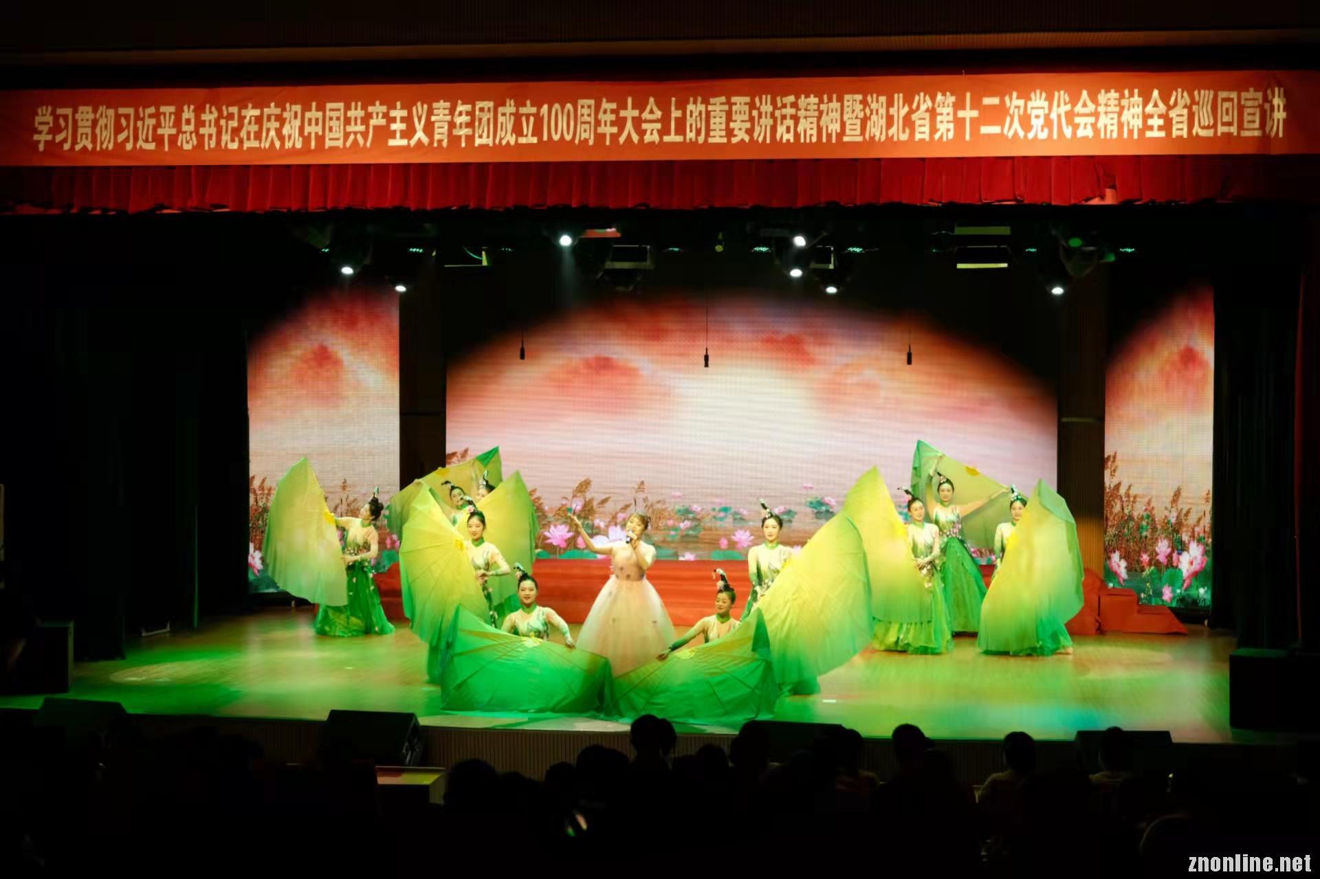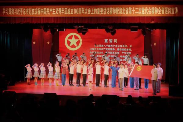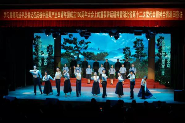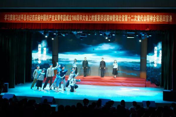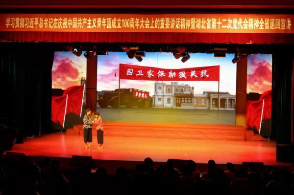 在团省委副书记陈立的开场宣讲中,她讲述了夏明翰、黄继光、王清珍等各个历史时期青年典型为追求共产主义的故事,生动诠释了习近平总书记在庆祝中国共产主义青年团成立100周年大会上的重要讲话精神,展现了湖北共青团追随中国共产党奋斗的百年历程。在本次宣讲中,武昌理工学院“百年追寻”音乐团课地市州巡演宣讲团以原创歌舞《守候》、情景演绎《北斗之光》、舞剧《青年志愿军》等红色剧目献礼党的生日。在舞剧《长津湖》中,团队以舞蹈编排的形式再现了长津湖战斗场景,20名舞蹈演员饰演冲锋在前线的英勇战士,展现了一批又一批的共产党人在党的领导下前赴后继,毅然地坚守在前线,为共产主义事业浴血奋战的画面。