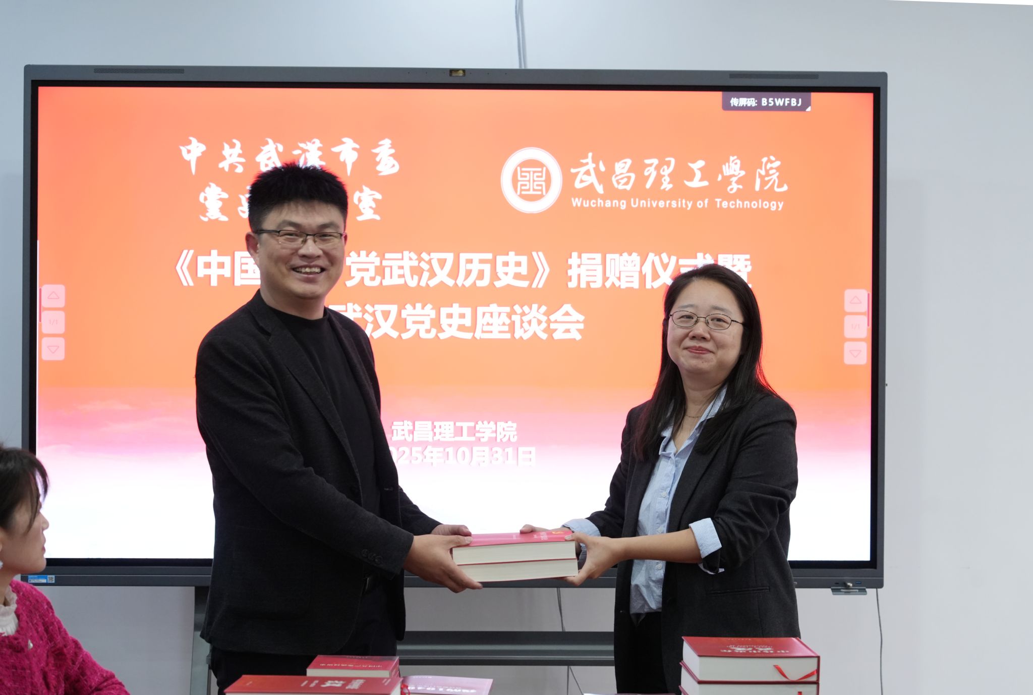 捐赠仪式由武昌理工学院党委副书记、副校长林娟教授主持。在与会人员的共同见证下,中共武汉市委党史研究室宣教处处长周薇、编研一处处长陈磊将承载着武汉厚重党史的书籍《中国共产党武汉历史》《中共中央在武汉》《我的1949:武汉解放口述史》《武汉英烈》等近150册,正式移交至武昌理工学院马克思主义学院副院长曾晓辉手中。座谈会上,双方围绕党史学习、教育、研究与传播进行了深入交流,并规划了未来合作蓝图。