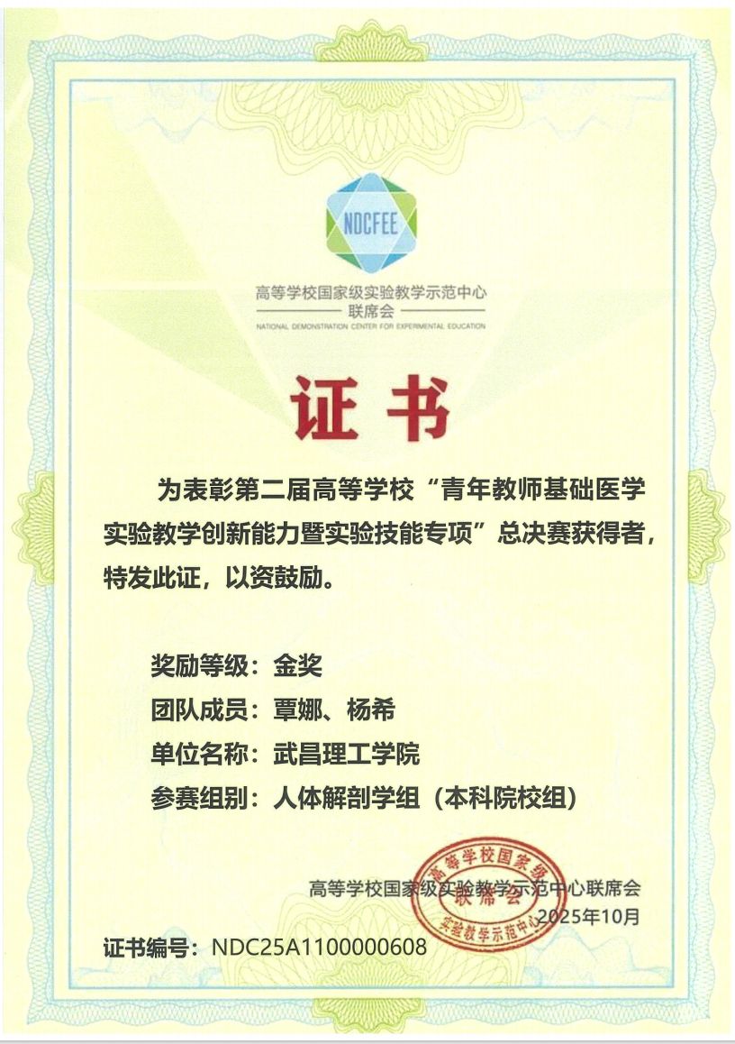 近日,第二届高等学校青年教师基础医学实验教学创新能力暨基础医学实验技能专项大赛决赛在广西圆满落幕。武昌理工学院健康与护理学院教师覃娜、杨希凭借出色表现,荣获人体解剖学组金奖。