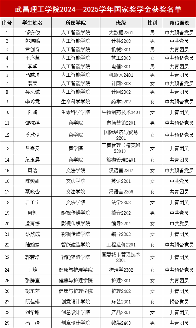 近日,2024-2025学年度本专科生国家奖学金获奖学生名单正式公布。武昌理工学院共有29名优秀学生获奖,每人每年奖励10000元。