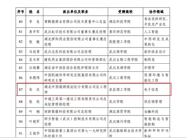 经个人申报、企事业单位和高校推荐、专家评审、社会公示等环节,确定2021年度湖北产业教授100名。100名教授来自武汉大学、华中科技大学、武昌理工学院等48所高校。武昌理工学院人工智能学院教授、湖北中图勘测规划设计有限公司总工程师安庆成功上榜,获评2021年度湖北产业教授。