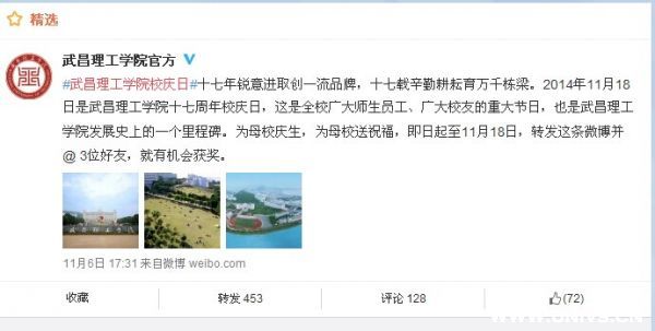 十七年锐意进取创一流品牌,十七载辛勤耕耘育万千栋梁。2014年11月18日是武昌理工学院十七周年校庆日,这是全校广大师生员工、广大校友的重大节日,也是武昌理工学院发展史上的一个里程碑。由武昌理工学院官方微博发起的#武昌理工学院校庆日#话题活动,短短几天时间阅读量就突破了35万次,单条微博转发450余次,祝福评论680余条。为母校庆生,为母校送祝福,武昌理工学院师生校友积极响应,一条条祝福语表达了对母校的热爱。