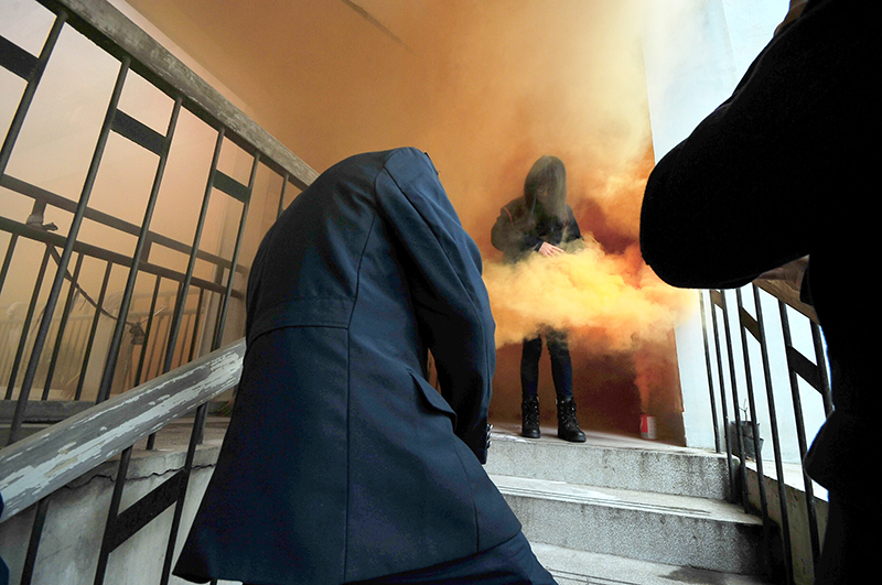 亲身体验过“模拟烟室”的该校14级新生贾思思谈起她的感受:“帐篷里面漆黑一片,还冒着浓烟,感觉很怕,也给我了很大感触,就是要学好消防知识和提高消防技能,这样才能在遇到突发事件时能很好的应对。”“大家对消防知识都比较薄弱,所以这场活动吸引了很多人的关注,除了学校师生,食堂的打饭阿姨也来了。” 会计1410班张姝婷看着高度仿真的实战演习,表示学到了很多实用技巧。