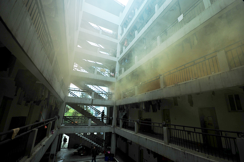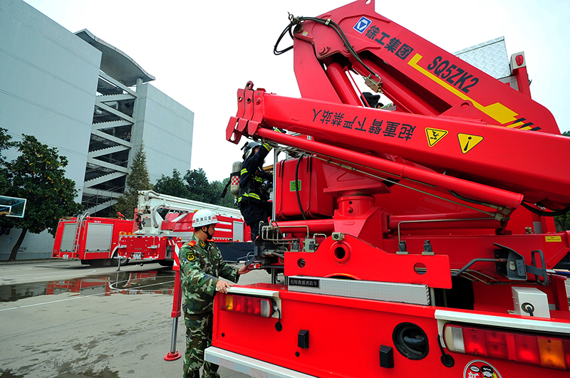 该校保卫处和学工处宿管科在水泥篮球场搭建了消防演习场地,邀请消防官兵指导学生亲身体验“应急疏散演练”、“模拟火灾消防演练”、“云梯救援”、“安全灭火”、“灭火器使用操作”等消防实战项目。