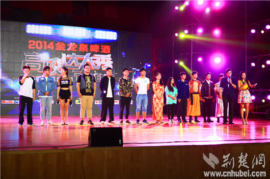 荆楚网消息(记者 陈敏 通讯员 王雨若)10月22日晚,位于武汉市江夏区藏龙岛的华中农业大学楚天学院室内体育馆光彩四溢,2014金龙泉啤酒湖北高校达人秀的半决赛现场,13组高校达人为6张宝贵的总决赛晋级券展开激烈争夺,为广大高校达人秀的粉丝们带来了一场狂欢之夜。经过激烈争夺,最终六组高校达人如愿晋级,获得2014金龙泉啤酒高校达人秀总决赛巅峰之夜的入场券。他们是:来自江汉艺术职业学院的0603号组合太阳打击乐团、来自武昌理工学院的0301号FOD组合、来自武汉工程大学的0105号肖道文、来自华农楚天学院的0430号组合“瓜子壳乐队”、来自武汉音乐学院的0429号严炼镝、来自汉口学院的0307号孙伟杰。