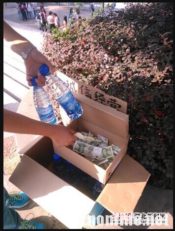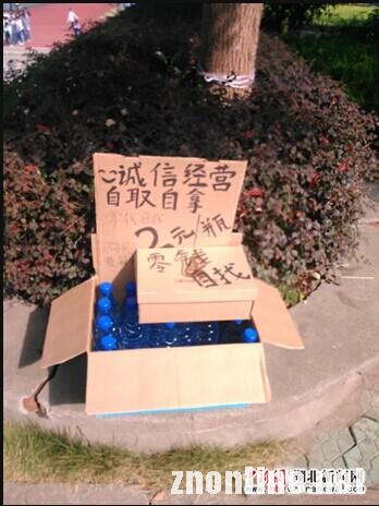“这个水摊放在这,需要同学们有高度的诚信和摊主对同学们充分的信任,这就像我们护理里面说的“慎独”一样。”23日, 武昌理工学院运动场旁出现一个“诚信经营,自取自拿”的卖水小摊,摊主是该校会计1409班的学生黄荞菲。箱子里放满了瓶装纯净水、箱子上面还设有零钱箱,供同学们自找零钱。