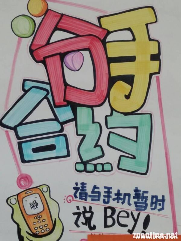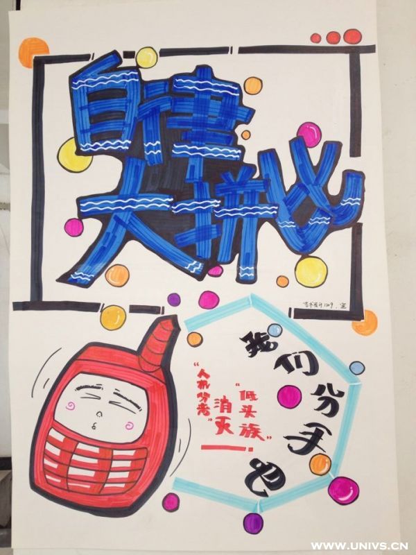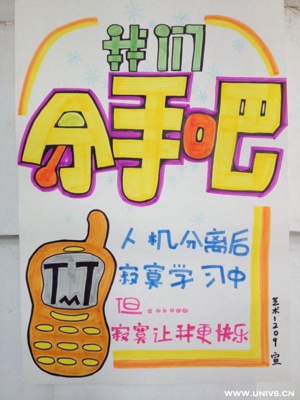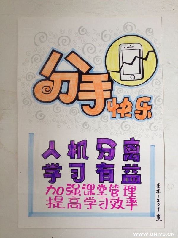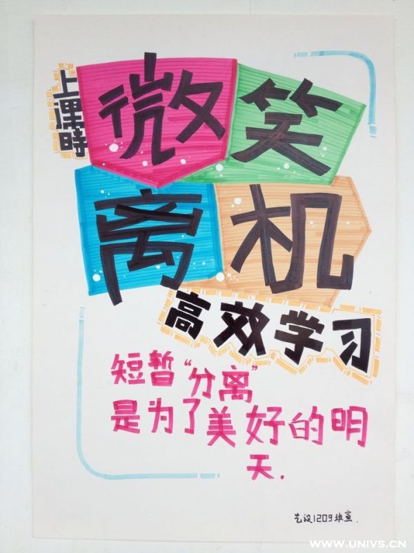 为了进一步宣传“人机分离”的管理制度,营造良好的学习氛围,让更多的同学易于接受和理解这项制度并在平日的课堂中执行,武钢老师将学校正在推行的“人机分离”制度带入课堂教学环节中,指导艺术1208、1209班的学生设计创作了一幅幅别开生面的POP宣传海报。每幅海报均以POP字体为载体,再用动漫人物将一句句宣传口号生动萌化的展现出来,更容易让人产生认同感,给人耳目一新的视觉感受。