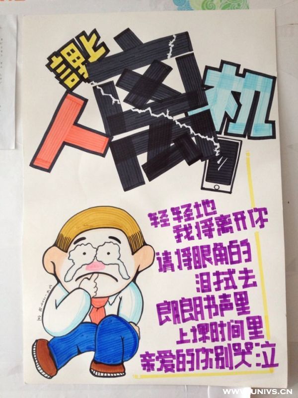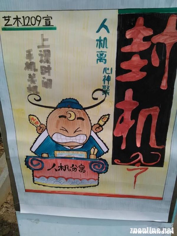 记者注意到,该校商学院门口张贴的“封机令”,配上萌化了的包公。另一张宣传海报则是一男子怀抱手机难舍难分的漫画,这些萌化的宣传海报带给人耳目一新的视觉体验。电商1402班的张俊玲同学看后表示:“真是萌萌哒!虽然这一管理条例有点严格,但是看见这些动漫海报觉得舒心不少。”