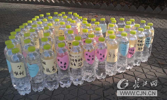 在送行毕业生时,该学院的学生便将这充满“爱心”的矿泉水送给每一位毕业离校的学长学姐们,一位毕业生看到写满祝福语的矿泉水打趣道:太有意义了,我都不舍得喝了,感谢学弟学妹们.