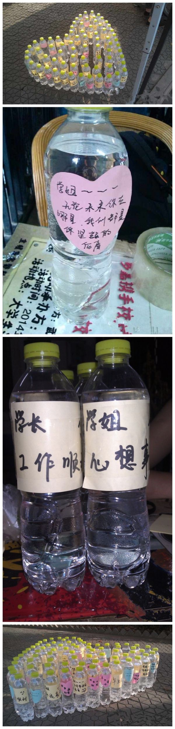 “希望能给学长学姐们留下一个难忘的回忆,在临走时能给开心一笑。”姜珊说,她们从超市买来了矿泉水,撤掉商标,贴上学弟学妹们对学长学姐的祝福标签,一共做了200瓶“爱心”矿泉水,她们在欢送毕业生帐篷前将其摆成了一个“心”形,以此表达对毕业学长学姐的祝福和关爱。