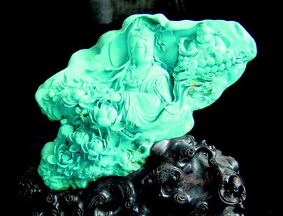 毗邻武当山的郧县云盖寺,是我国最古老、最大的绿松石矿产地。1988年,袁嘉骐慧眼相玉发现一块 50多公斤的绿松石大料,尽管很多人不看好这块料,袁嘉骐仍力陈己见,说服单位将其购回。经简单处理,璞玉果然露出纯正匀净的天蓝色。经专家鉴定,此巨型宝石级绿松石,堪与宝石家族中第一大钻石、第一大红宝石媲美。“我此前有过多件获奖作品,但相比之下都是雕虫小技,要雕好这块绿松石,我必须全身心付出”,袁嘉骐说,接下来四年间,他和在同一单位的妻子皇甫映没日没夜地围着这块绿松石忙碌,最终以深厚的艺术功底及娴熟的雕琢技艺,完成了恢宏的《武当朝圣图》巨型作品。其正阳面雕有87位仙道游山朝圣,雍容华贵中显露出仙风道骨,刀斧琢迹中透“吴带当风”之神韵。背阴面设计了武当月色、百鹤投林及朝圣者夜归等。人物刻画逼真细致,云雾缭绕中写意地透出层峦叠嶂、金殿高耸、青松翠柏、亭台楼廓,小桥流水,气势磅礴。