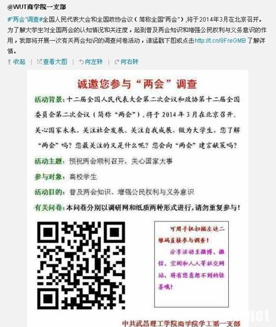 记者从宣传栏上了解到,本次活动将持续到两会闭幕,网络版问卷可登陆 http://www.wenjuan.com/s/fAVBJ3 参与,也可以关注新浪微博 @WUT商学院一支部 扫描二维码参与。对于其后续活动和问卷分析报告,记者也将跟踪报道。(完)