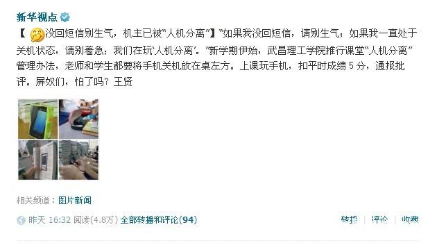@新华视点 : 【 没回短信别生气,机主已被“人机分离”】“如果我没回短信,请别生气;如果我一直处于关机状态,请别着急;我们在玩‘人机分离’。”新学期伊始,武昌理工学院推行课堂“人机分离”管理办法,老师和学生都要将手机关机放在桌左方。上课玩手机,扣平时成绩5分,通报批评。屏奴们,怕了吗?王贤