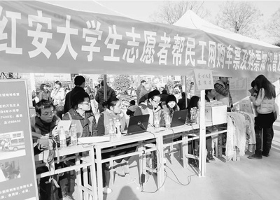本报武汉1月22日电 (记者田豆豆、付文)记者今天从武昌理工学院获悉:放寒假后,该校大四学生梅文祥和同学们组团帮农民工网上抢票,截至目前已抢到100多张火车票,受到农民工兄弟称赞。