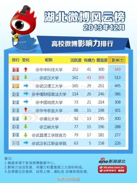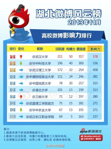 影响力由活跃度、传播力和覆盖度三大指标构成。来自新浪微博数据中心的数据显示,在2013年12月湖北微博风云榜高校微博影响力排行榜中,武昌理工学院官方微博以79分的活跃度、17分的传播力、181分的覆盖度和277分的影响力入围10强,并位列第9位。而武昌理工学院微博在2013年10月和2013年11月湖北微博风云榜高校微博影响力排行榜中皆入围十强,均位居第8位。