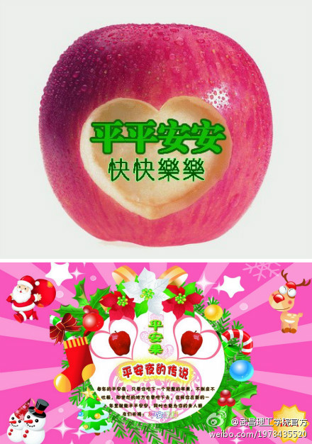 在平安夜这天吃苹果或者送苹果给朋友寓意“平平安安”,在这一天,普通的苹果就变成了充满祝福的“平安果”,这在高校更为流行。不少大学生瞅准“平安果”商机,销售平安果大赚一笔。