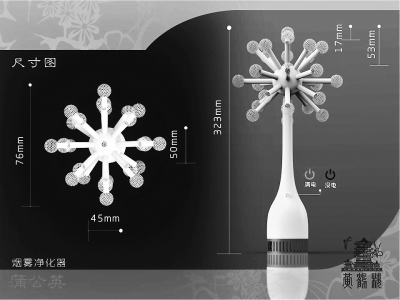 该烟雾净化器采取蒲公英式外形设计,吸烟口设计为球面,极大增加了吸附面积,能迅速清除室内烟雾,净化空气,可广泛用于卧室、酒店、办公室等小型场所。该作品获大赛一等奖。