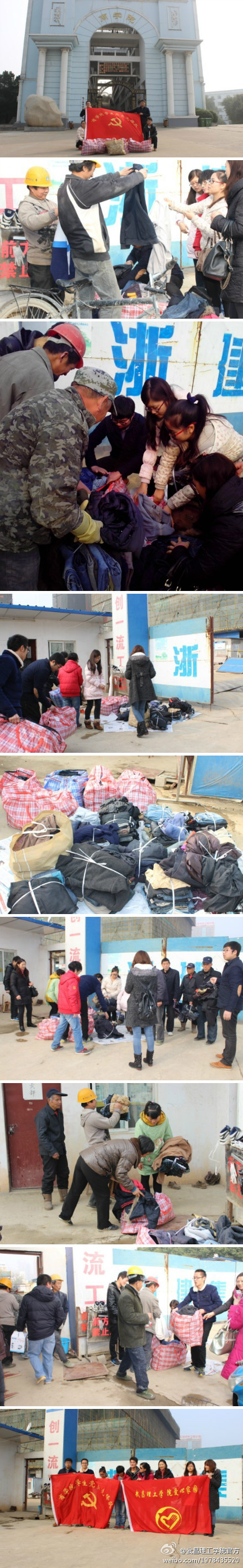 昨日下午,在该校爱心家园两位指导老师的带领下,大家将清洗干净、折叠整齐打包好的300余件衣物送到了武汉南湖边的浙江第一建筑公司武汉工地上。得知他们的到来,工人们有秩序的来到现场迎接同学们的到来,前来的工人们非常感动,一位工人大叔说:“夏天你们给我们送来了军训服装,我们的工友们穿着都很高兴,要是到外面地摊上去买也要20几元一套,你们给我们送来的不仅是可以使用的衣物,更多的是温暖,谢谢!谢谢!”还有一位工人也说:“这件棉袄我穿很好,谢谢你们,还是大学生好。”看见工人们拿着自己满意的衣裳,笑逐颜开的时候,在场的师生们都感到自己的辛苦是值得的。