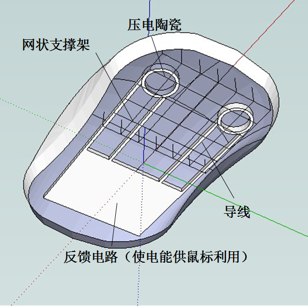 作品简介:通过鼠标点击,将机械能通过压电材料转化为电能,并储存在鼠标内部的电容中,以实现自供电的目的,杜绝了使用电池带来的污染。