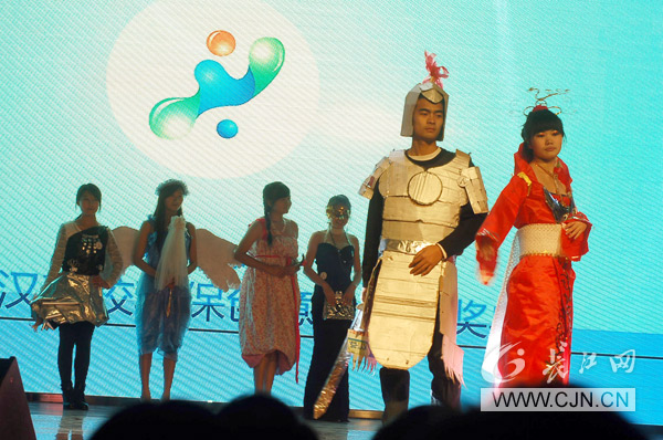 随着动感音乐的响起,多名华科大文华学院的学生身穿由蚊帐、彩纸制成的时装走起了“秀”,正式拉开颁奖典礼的序幕。
