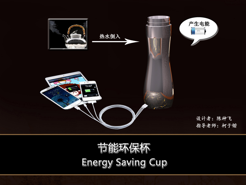 作品简介:在普通的保温杯中安装热传导装置,通过杯内外部的温差实现发电,并通过杯身的USB插口,为手机、pad等电子设备充电。