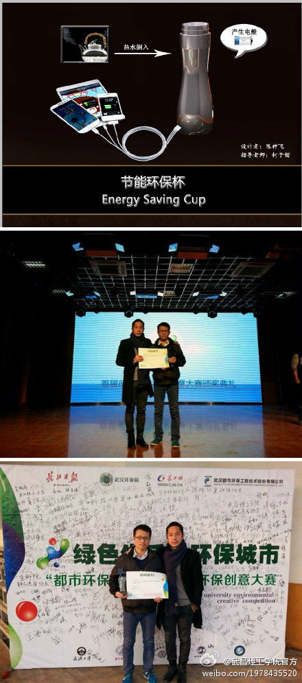 日前,由长江日报、武汉市环保局等主办的首届“都市环保杯”高校环保创意大赛落下帷幕,武昌理工学院建筑学专业1201班的陈神飞同学凭借自己发明的“温差发电杯”一举摘得创意大赛的一等奖。