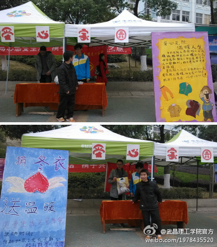 “当你在别人有困难的时候,慷慨地伸出你的援助之手,你会感到快乐;当你在接受别人的帮助时,你会感到世界尽是温暖。”寒风中,一块宣传板的内容格外暖人心。近日由于气温逐降,武昌理工学院爱心家园协会在文化长廊举行“捐冬衣送温暖”活动,旨在为那些缺乏棉衣过冬的农民工带去温暖,也让同学们将已经不需要的衣物合理利用,活动将持续到下周一。