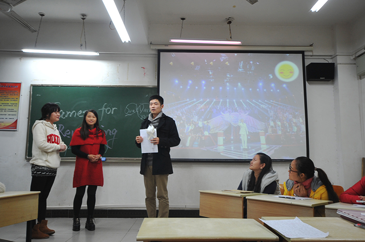 “我的课程是主要是培养学生口语能力,创造让学生说英语的机会,所以形式就不用太过于拘谨。而学生们学英语的方式一般过于死板,我希望学生们能在一种轻松地氛围中学习,这样他们才更愿意说,所以在我的课堂上,课堂的主动权都是交给学生。”王曼莉老师说道。