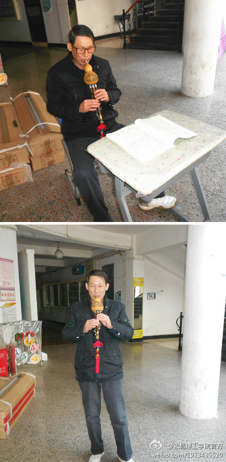受音乐专业学生的熏陶,武昌理工学院艺术学院大楼管理员王建成大爷点燃了对音乐的学习热情,近日他自学葫芦丝,并学会了吹奏多首高级曲目而受到学生的热捧。日前,他演奏的一曲《竹楼情歌》优美动听,受到学生的围观和欢呼。不少学生打趣表示,如果你还在为自己没有一技之长而苦恼,还在担心学习过晚而有心无力,那就学学王大爷吧。