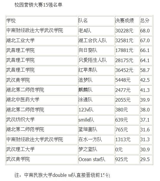 昨日,长江商报第四届大学生校园营销大赛决赛成绩出炉。武汉23所高校的43支队伍经过激烈角逐,决出15强。其中,武昌理工学院有三支队伍晋级15强,是晋级最多的高校之一,分别是向日葵队、只爱陌生人队和红苹果队,各位居3、4、5位。