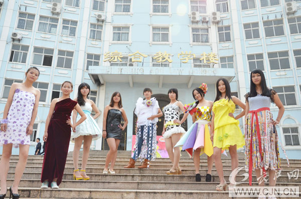 “真难想象这些美丽的衣服是由旧报纸、窗帘、蚊帐、塑料等废弃物做成的,佩服设计者们的创作才能。”商学院国际商务班1201班李瑞雪同学感叹道。