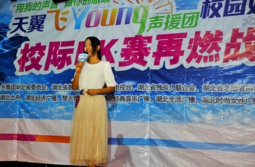 “没有眼睛,但上帝留给你耳朵去倾听美丽的世界,用爱心点亮他们的世界,让关怀成为一种习惯”。10月15日是国际盲人节,同时也是国际助盲日,由省团委、省残联、省广电总台、省青年志愿者协会联合主办,武昌理工学院承办“用我的声音做你的眼睛”大型公益活动在大学生活动中心三楼举行。著名网络歌手王麟前来助阵,引起学生们一阵阵欢呼和尖叫。湖北广播电视台的陈台长给王麟颁发了“爱心大使”荣誉证书,表示对她关爱盲人的无限感激之情。王麟表示愿意和大家一起关心盲人,传递爱心。(武昌理工学院 梅高强 孙水霞 彭建军 杨旭帆)