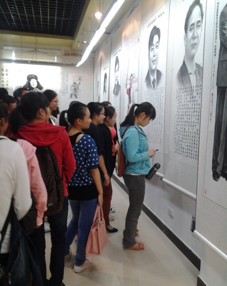 进入展厅,“十八大常委画像”、“东方醒狮”、“喜庆图”等作品映入眼帘,配上众多优秀书法家对党的十八大精神的书写创作,书画家们用自己的方式抒发了对中国共产党的热爱之情,让参展的同学叹为观止。可谓丹青绘盛世蓝图,翰墨书时代华章。